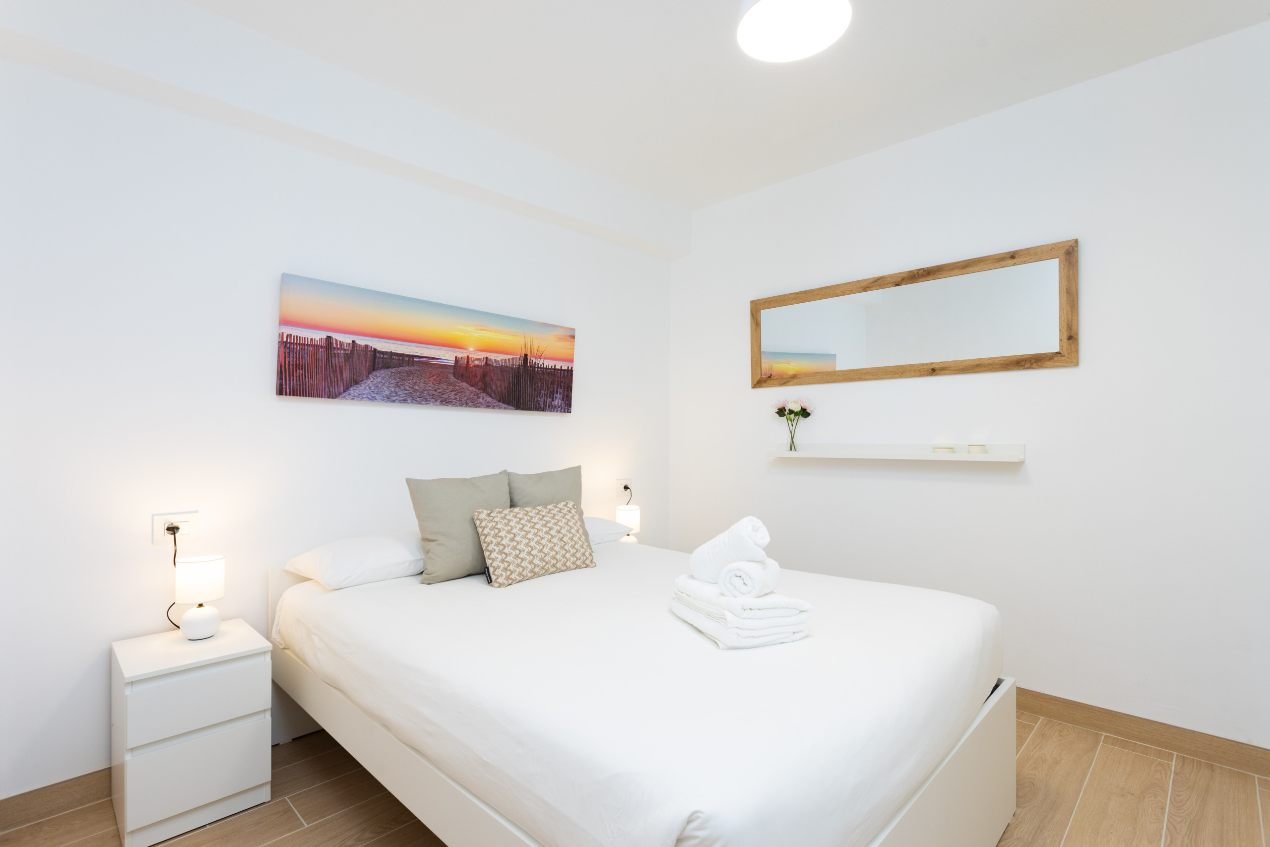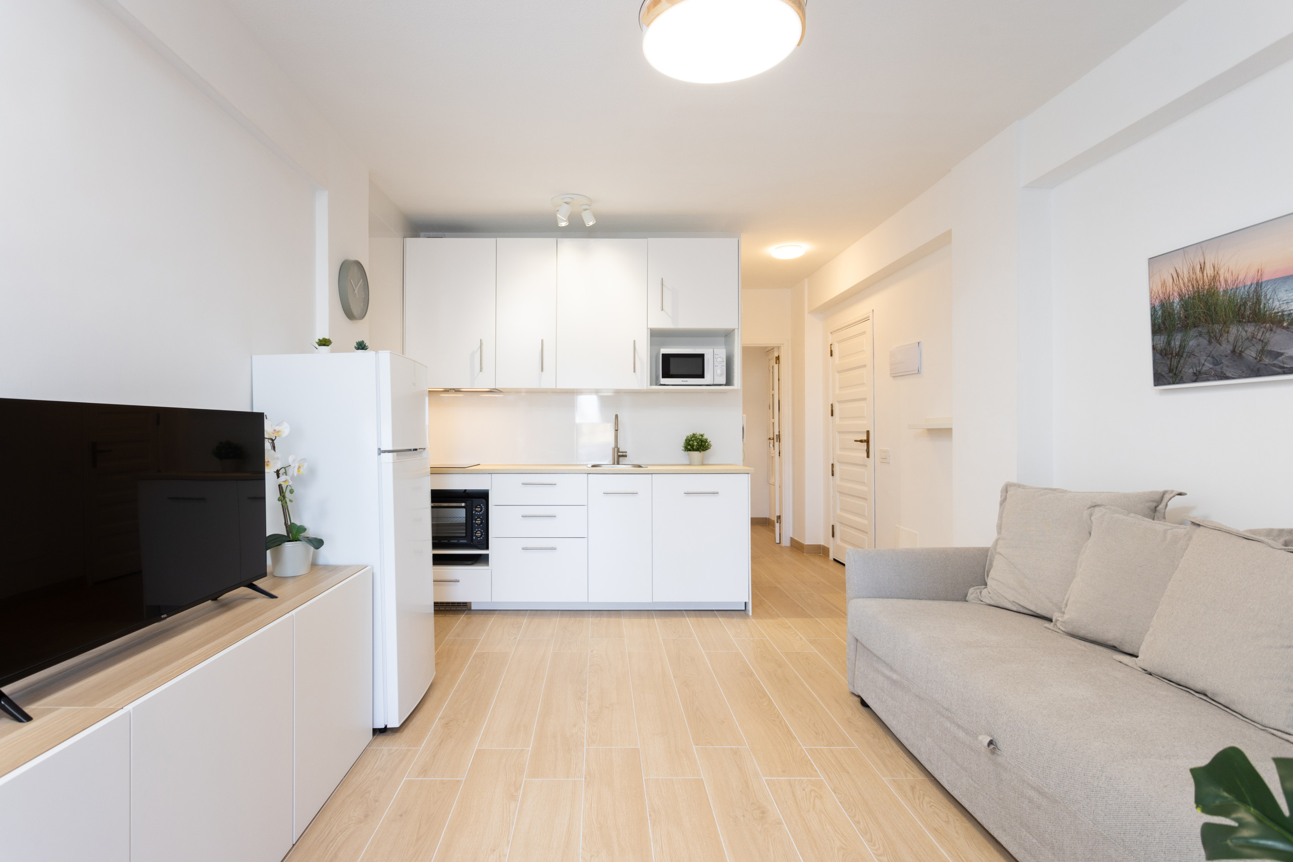 El apartamento es de un dormitorio con cama de matrimonio y con dos armarios empotrados. La cocina es abierta, muy cómoda y práctica y está totalmente equipada con todo lo necesario. El comedor se encuentra al lado de la cocina. El salón cuenta con un bonito espacio para el descanso, con Smart TV y una amplia salida a la terraza. En la terraza se puede disfrutar del sol, de las vistas y de las comidas al aire libre también. El apartamento cuenta con un baño amplio.