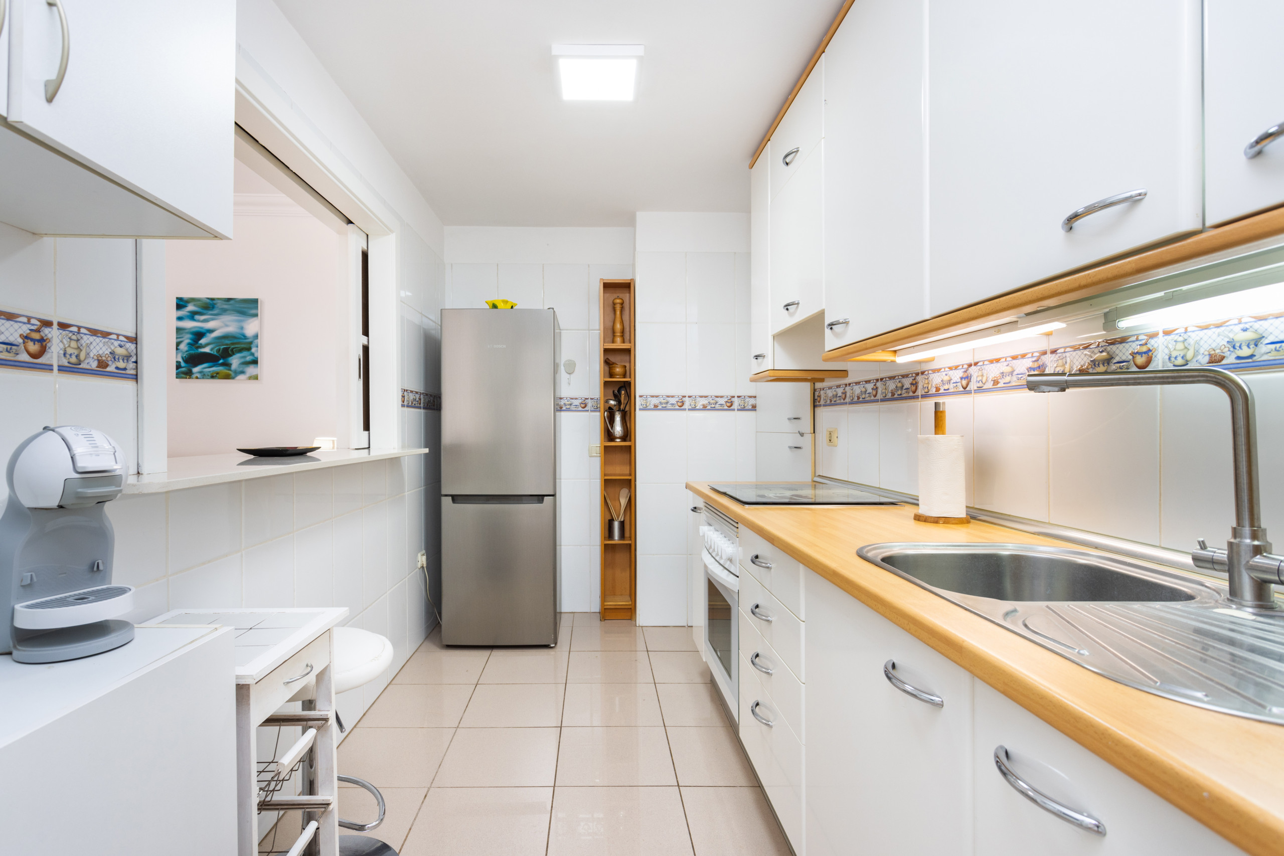 La cuisine indépendante est entièrement équipée d'appareils électroménagers de dernière génération : plaque vitrocéramique, four, micro-ondes, cafetière, grille-pain, bouilloire, réfrigérateur, congélateur, machine à laver et vaisselle complète. Vous pourrez préparer de délicieux repas comme si vous étiez chez vous.